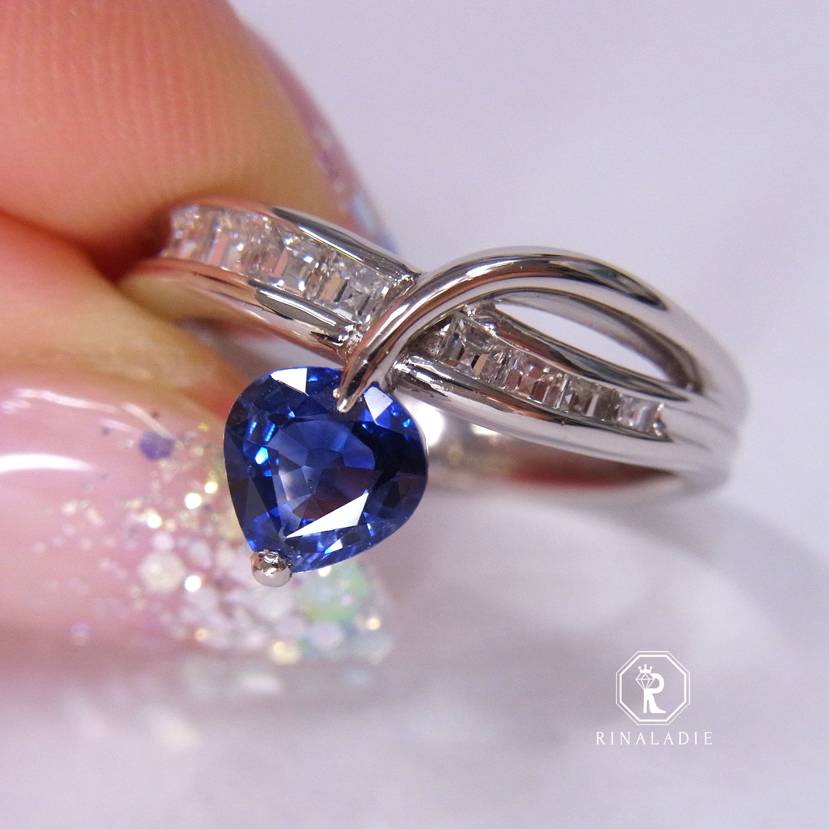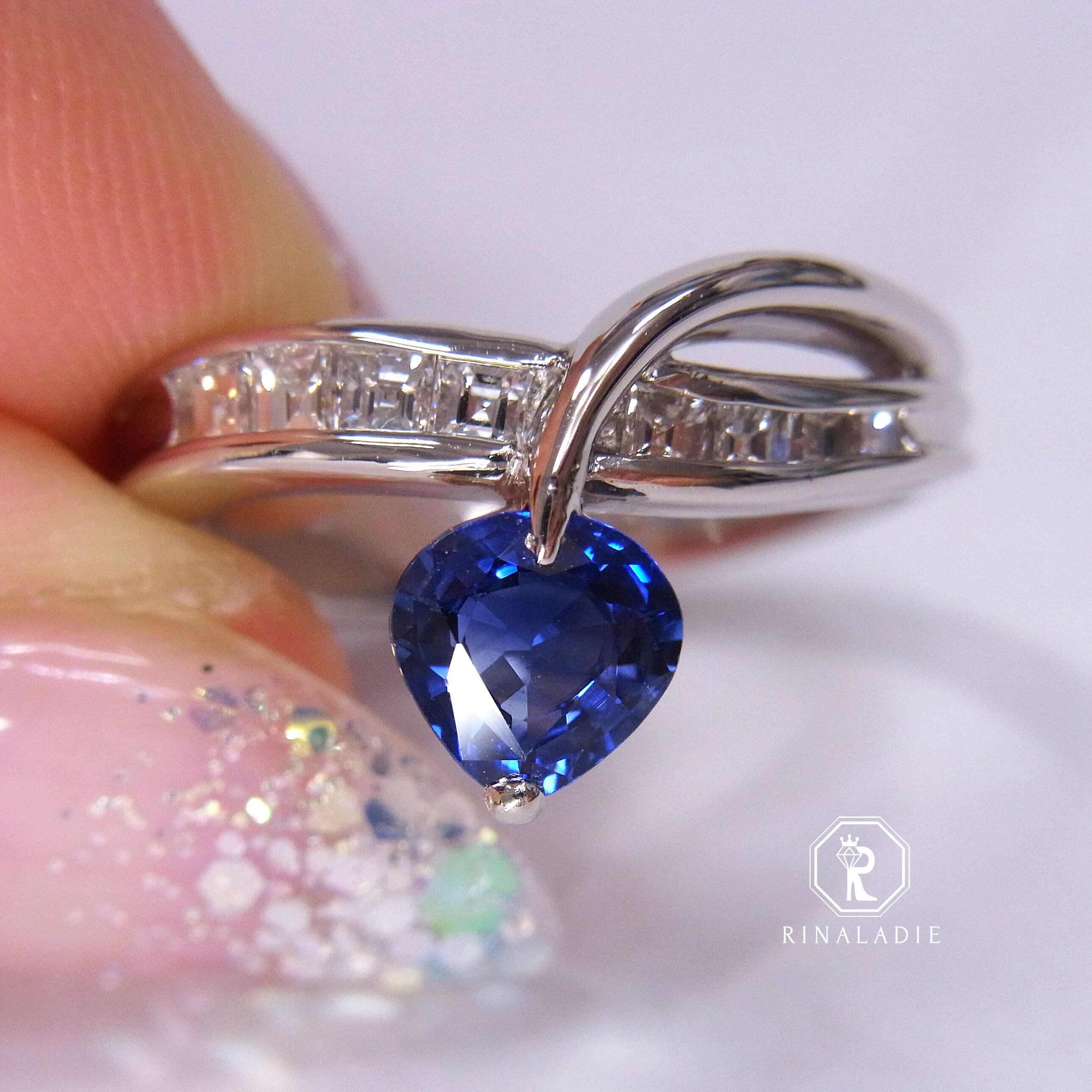 カレイカットの直線的な輝きが、サファイアの青をより一層引き立て、洗練された印象に。