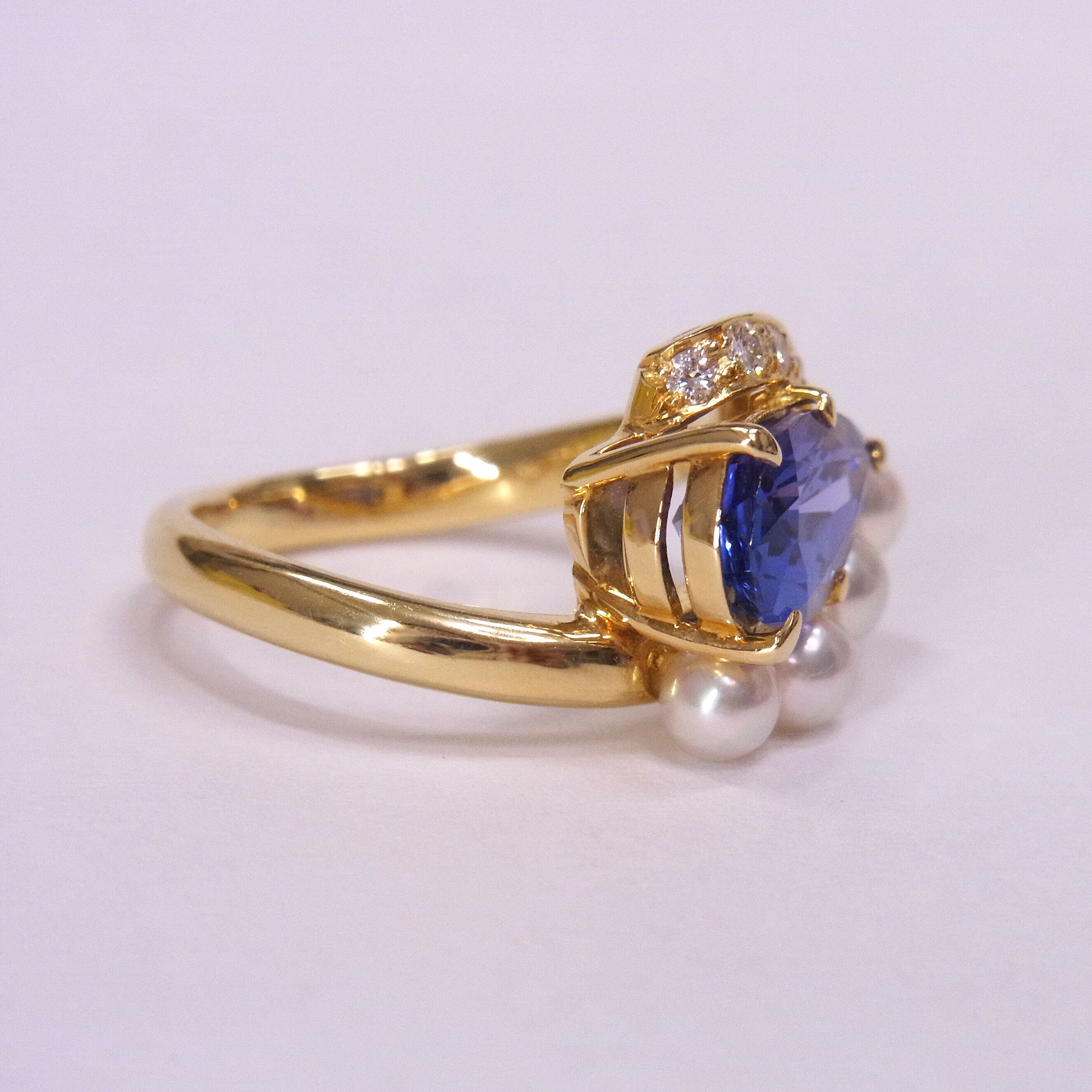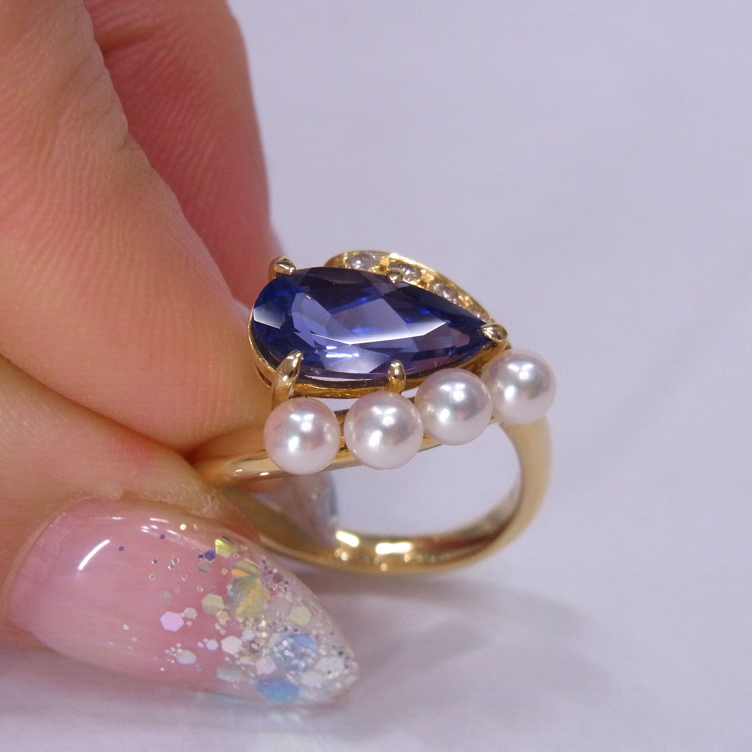K18YG天然タンザナイト ベビーパール(あこや)ペアシェイプのリング