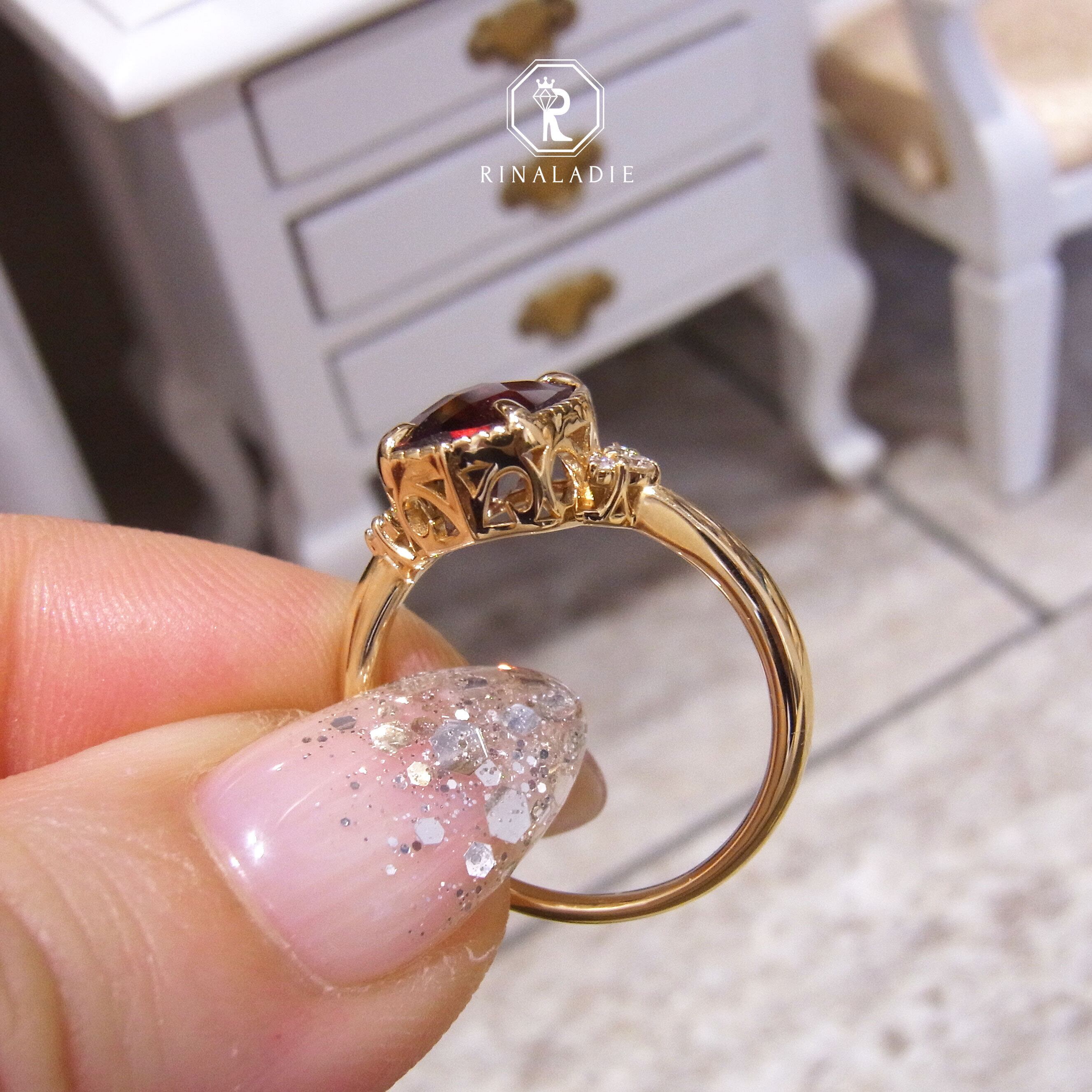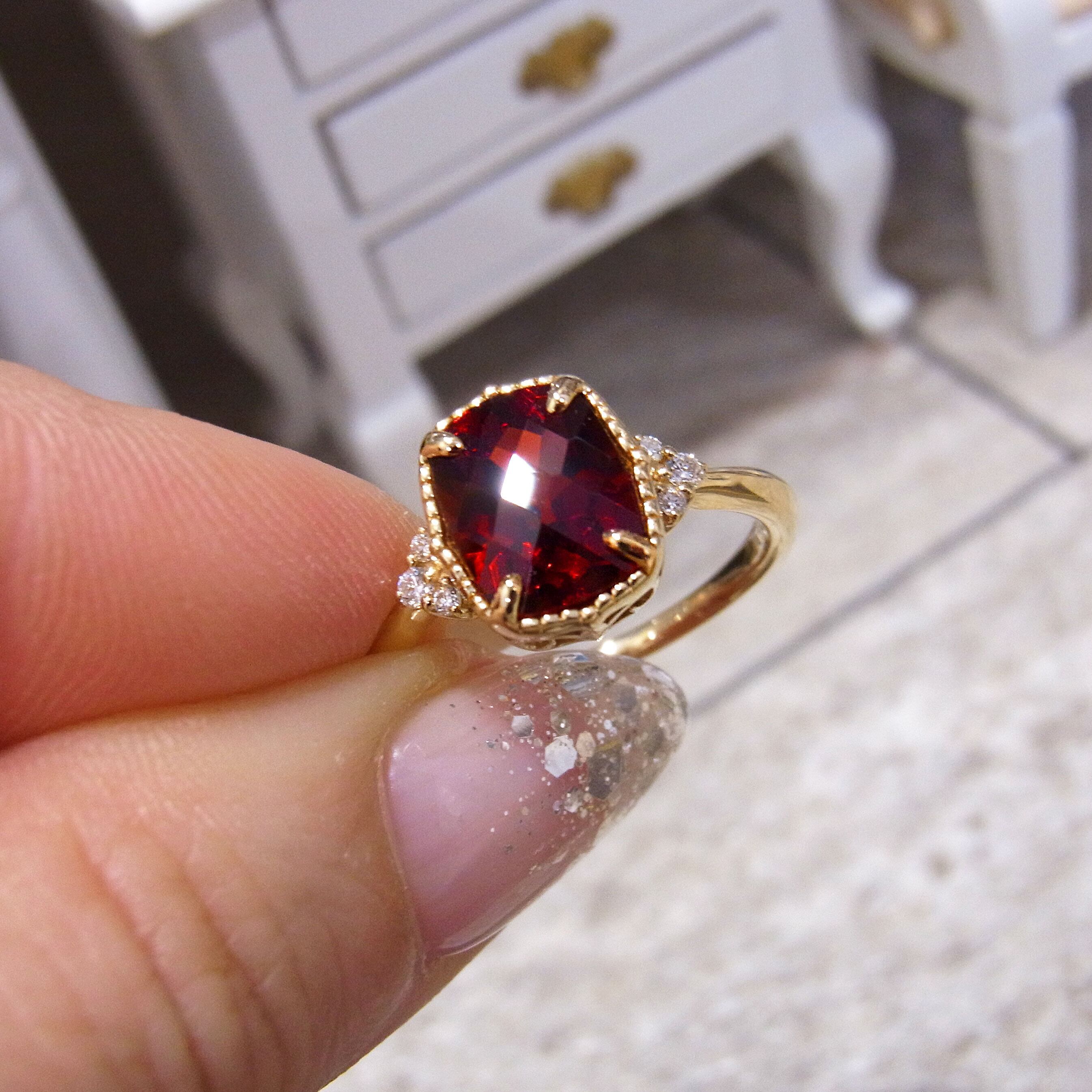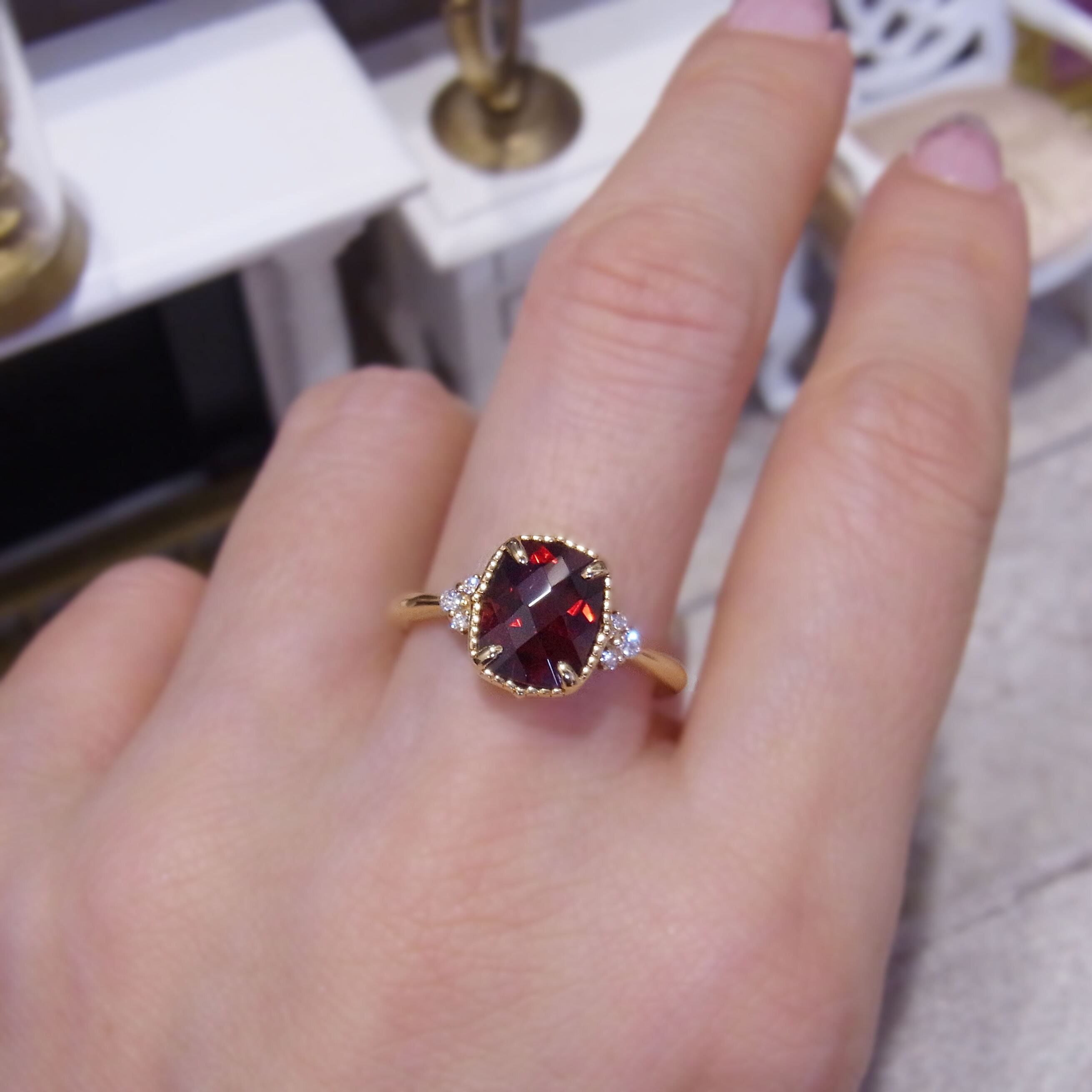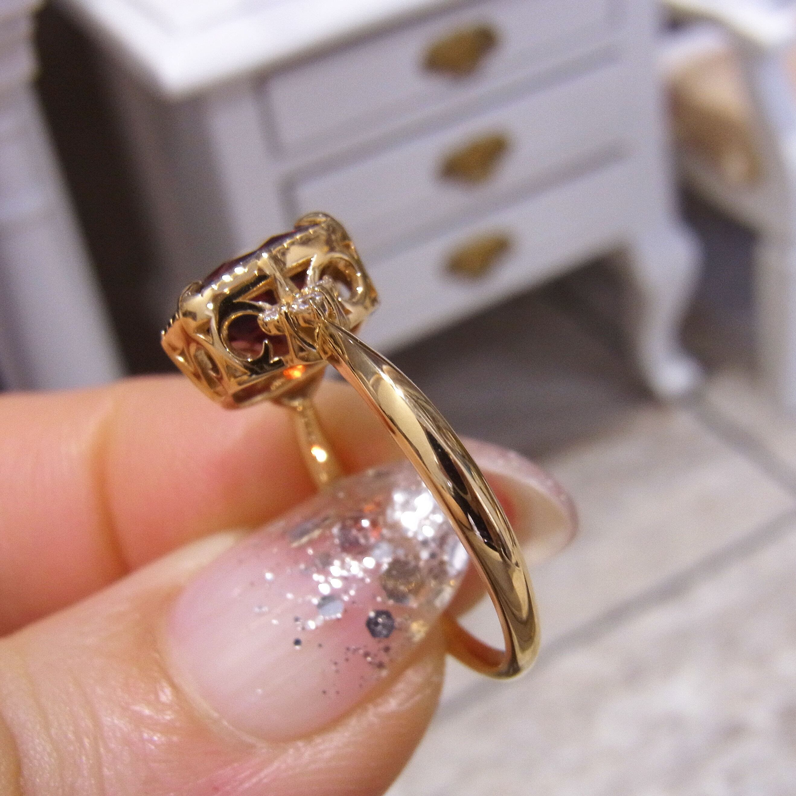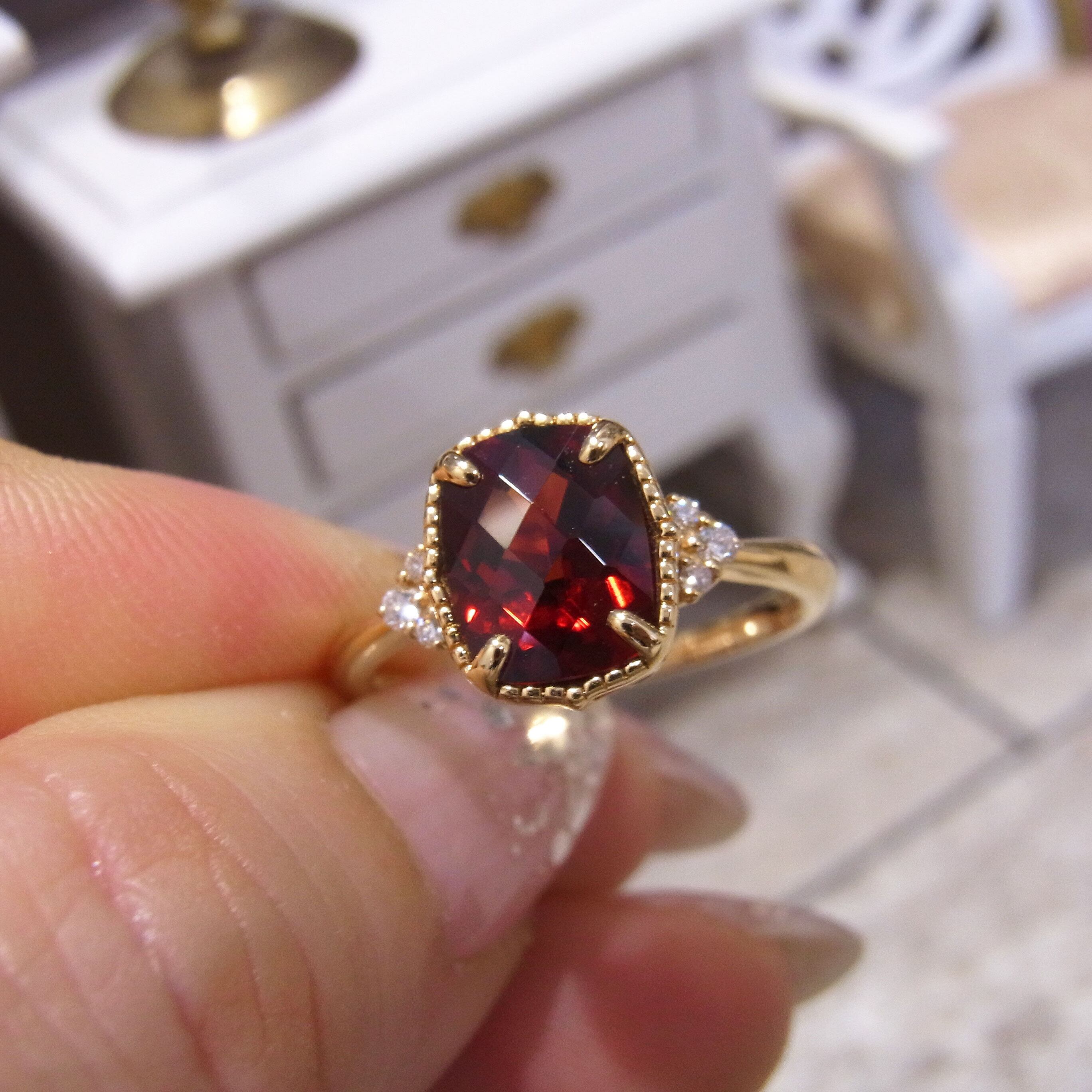 K18YG天然ガーネット深紅の鮮やかなミル打ちチェスカットリング