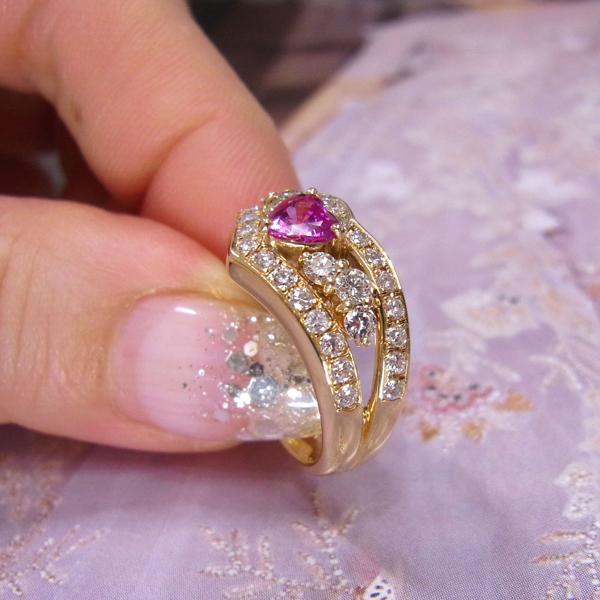 中央に宿るのは、可憐でありながら、どこか意志の強さを感じさせるハートシェイプのピンクサファイア。